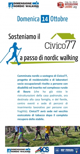 Camminata nordic walking a sostegno di Civico77, progetto di residenzialità e di laboratori socio occupazionali rivolto a persone con disabilità ed inserito nel complesso rurale di Baura - Frazione del Comune di Ferrara (che ha già visto le ristrutturazioni della casa padronale, ora destinata alla casa famiglia, e del fienile, centro eventi e sede di percorsi di inserimento lavorativo per persone con fragilità). Civico77 avrà sede nel vecchio essiccatoio di tabacco dopo il completo recupero dello stabile.